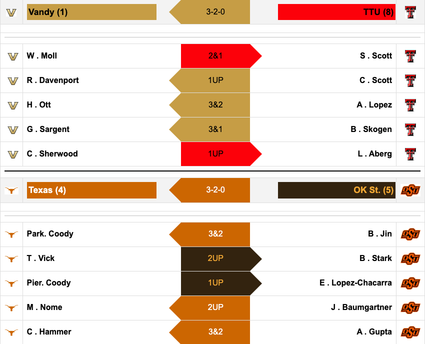 The three pairings that Texas won didn't require the same amount of comebacks as Vanderbilt. Texas' Parker Coody trailed for only two holes and beat Oklahoma State's Bo Jin. Mason Nome never trailed and won 2 and 1 against Jonas Baumgartner, and Cole Hammer claimed the fianl point for the Longhorns with a 3 and 2 win over Aman Gupta to move on.