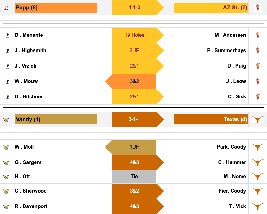 Vanderbilt and Texas will meet up in the semifinal round, this evening. The semifinal matches are set to begin 3:45 p.m. ET with the first groups going out for Pepperdine and Arizona State. The first group for Texas and Vanderbilt will tee off at 4:35 p.m. ET.