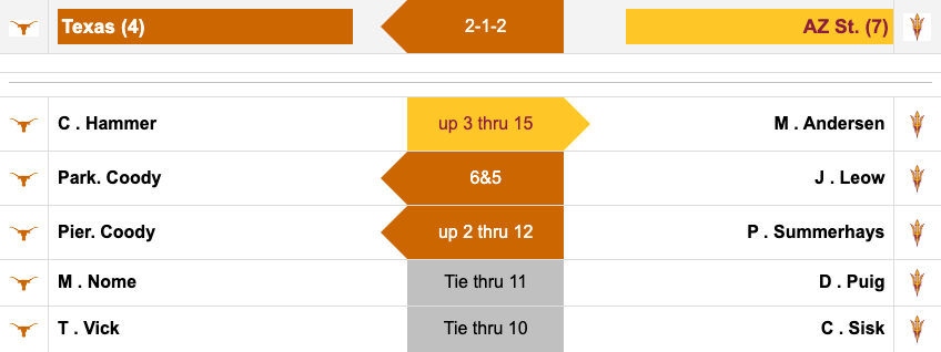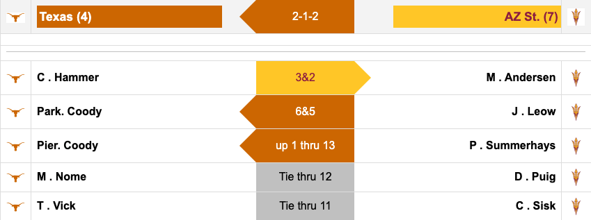 Texas holds the lead in one match that is currently in play. Pierceson Coody is up two through 12 over Preston Summerhays. Arizona State does have the chance to get a point with Mason Andersen up three through 15 over Cole Hammer. The matches between Nome-Puig and Vick-Sisk are both tied.