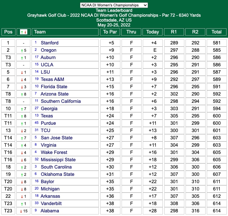 Halfway through the stroke-play portion of the 2022 DI women's golf championship, Stanford remains at the top of the leaderboard at 5-over. The Oregon Ducks (+9) were able to pick up four shots on the Cardinal and move into second place after starting the day eight back in seventh. Day three of the championship begins on Sunday.