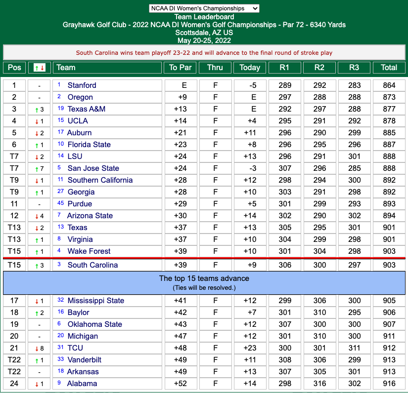 The third round of the 2022 DI women's golf championship is underway. The field will be cut down to 15 teams after Sunday's third round. As it stands, there are teams tied or within two strokes of that final spot to make it to the fourth round.