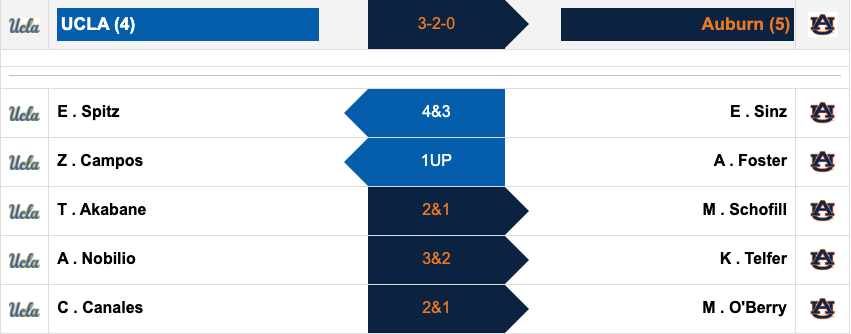 Just like Texas A&M's win earlier, Auburn was able to advance thanks to winning the last pairing of this match. Mychael O'Berry was able to outlast Caroline Canales in a back-and-forth match to give her team the deciding point. Prior to the 16th hole of the match, neither player had more than a one-up lead. O'Berry was able to gain some separation with two left to play before closing it out.