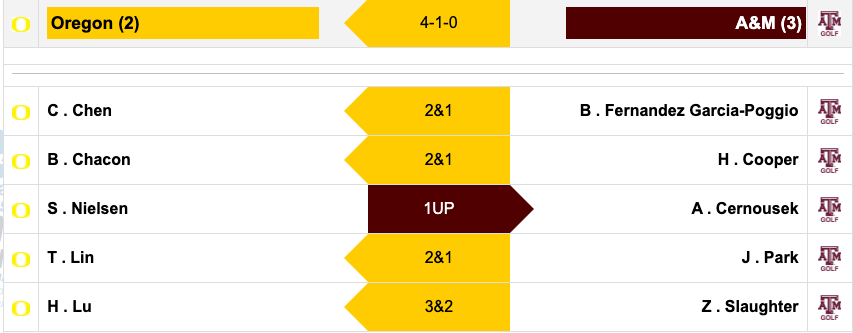 Oregon and Texas A&M have punched their tickets to the semifinals of the 2022 DI women's golf tournament. The Ducks and Aggies will face one another in the next round starting shorty after all the quarterfinal matches have concluded.