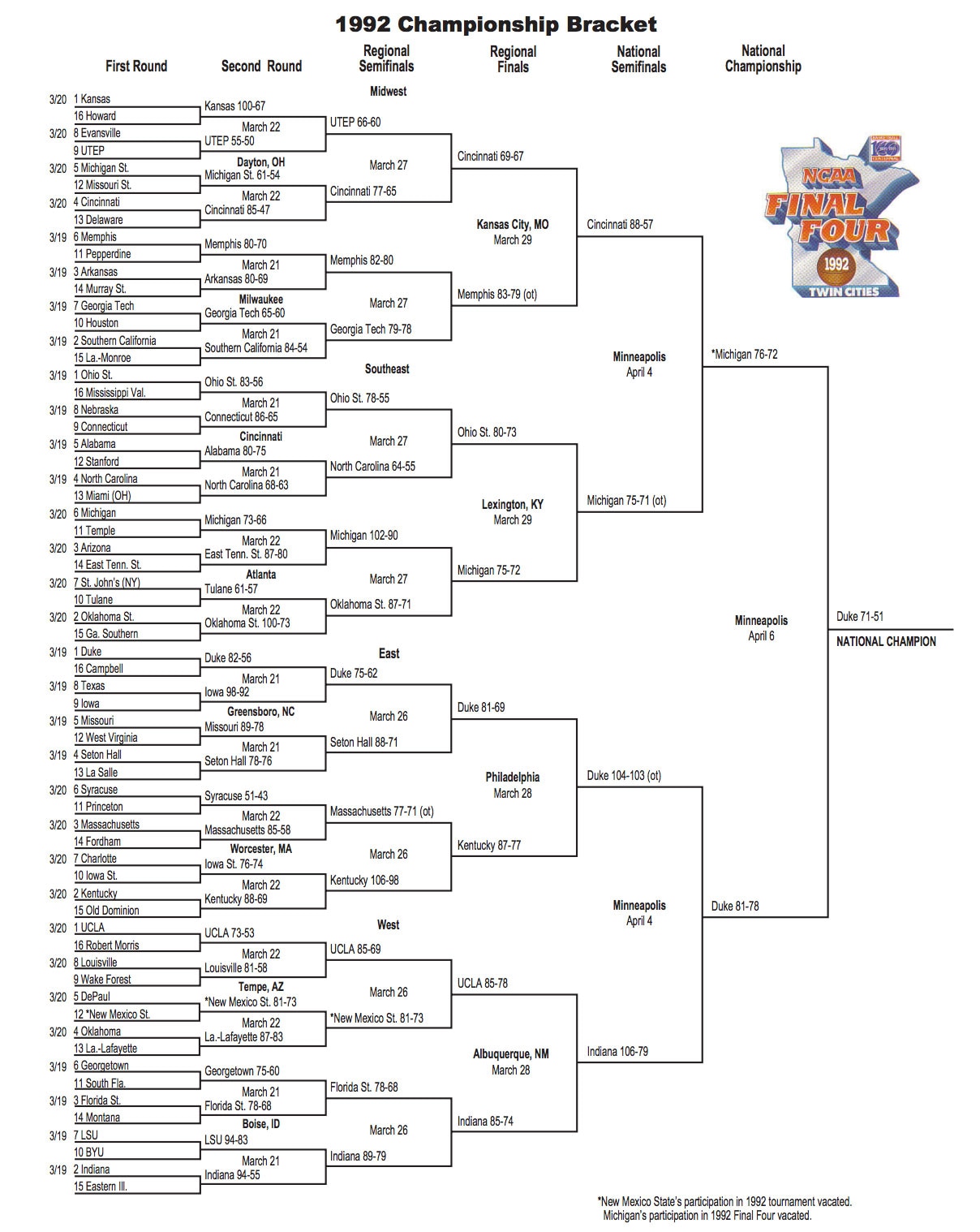 The 1992 NCAA tournament saw Duke win its second consecutive national championship after beating Michigan in the final. The Blue Devils' run to the title included .