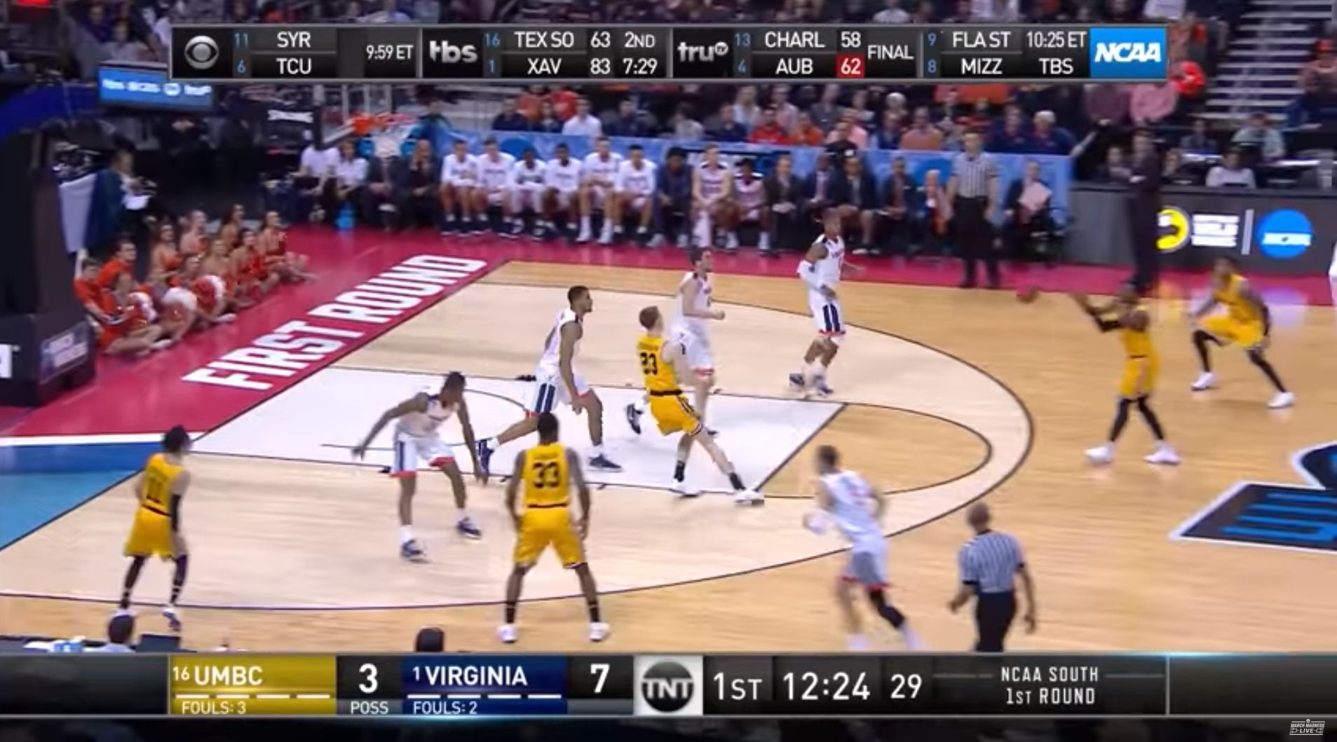 Curran, wearing jersey No. 23 at the left elbow in the screenshot below, found Jourdan Grant wide open at the top of the key for a straightaway 3-pointer, as one Retriever reserve found another to end what was approaching six minutes without UMBC seeing a non-free throw attempt go in the bucket. "You need second possessions against Virginia," Raftery said. "You've got to work the glass cause any long rebounds, advantage to the offense."