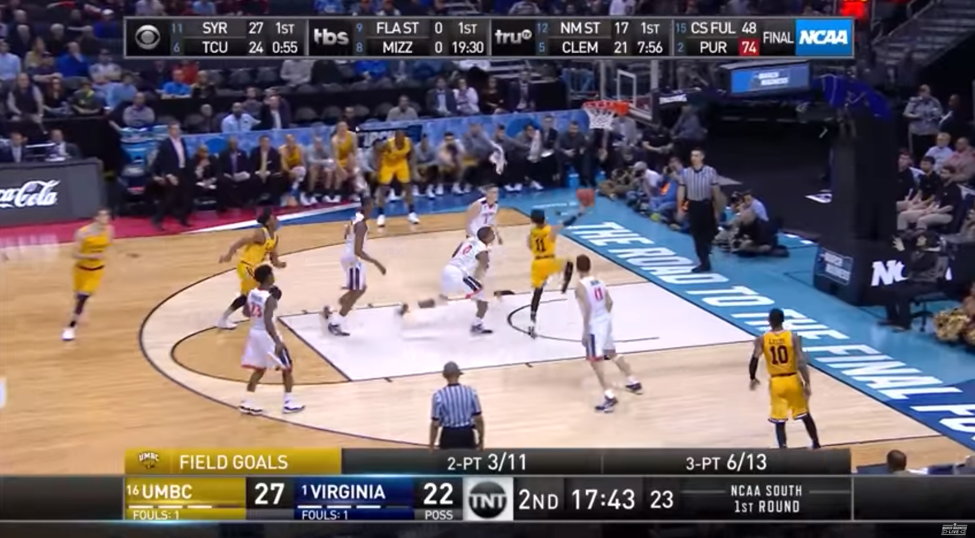 That run overlapped with a 17-3 run, as a 16-10 Virginia lead turned into a 27-21 advantage for UMBC, which then grew to 41-27. An exclamation point amid that run was when Maura, the diminutive point guard, expertly changed his pace at the right time to blitz through the Cavaliers' porous transition defense and scooped in a one-handed layup that put UMBC up by seven and forced a Virginia timeout.