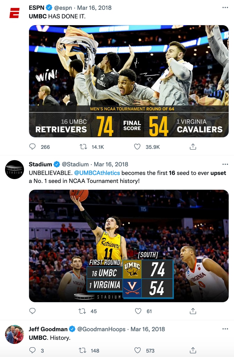 When Virginia and UMBC tipped off around 9:20 p.m. ET that night, No. 1 seeds in the NCAA men's basketball tournament were 134-0 against No. 16 seeds since the field expanded to 64 teams in 1985. Fellow No. 1 seed Xavier was already on its way to improving that unblemished record to 135-0. So, understandably, the announcing crew figured this game would be a chance to learn how to play, and win, without Hunter while facing a presumably overmatched opponent.