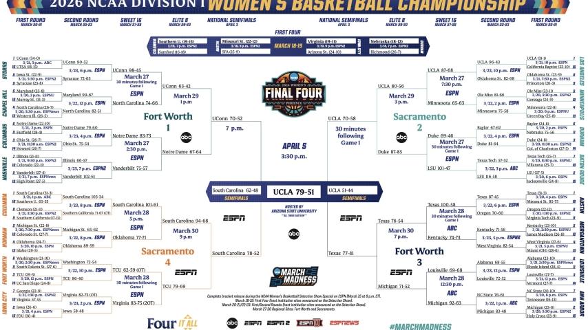 Just over a week after winning the 2026 women's college basketball national championship, UCLA had a record five WNBA first round draft picks and six taken overall. Lauren Betts, Gabriela Jaquez and Kiki Rice were taken with picks Nos. 4-6 on Monday night. Meanwhile, UConn's Azzi Fudd went No. 1 overall.