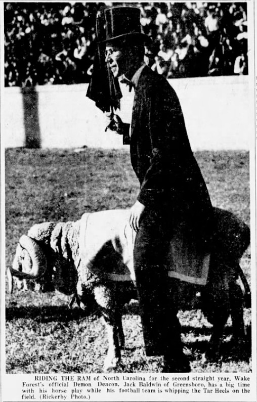 Below is a picture of Baldwin "riding" North Carolina's ram mascot during a football game in which Wake Forest was beating North Carolina. The picture was printed in The Charlotte News on Oct. 27, 1941.