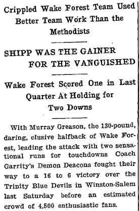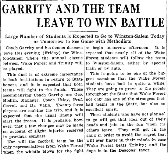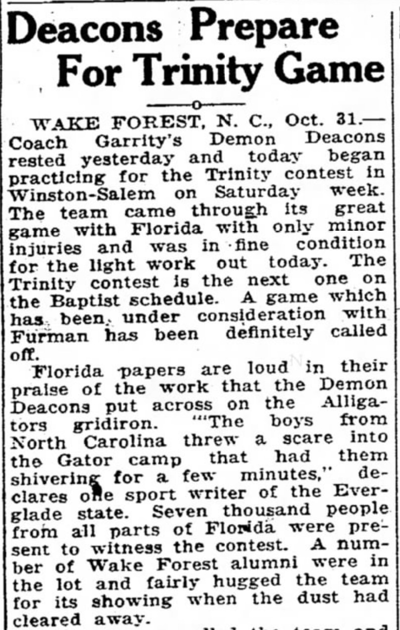 The following was published in The Bee of Danville, Va., on Nov. 1, 1923. "Coach Garrity's Demon Deacons rested yesterday and today began practicing for the Trinity contest in Winston-Salem on Saturday," the newspaper reported.