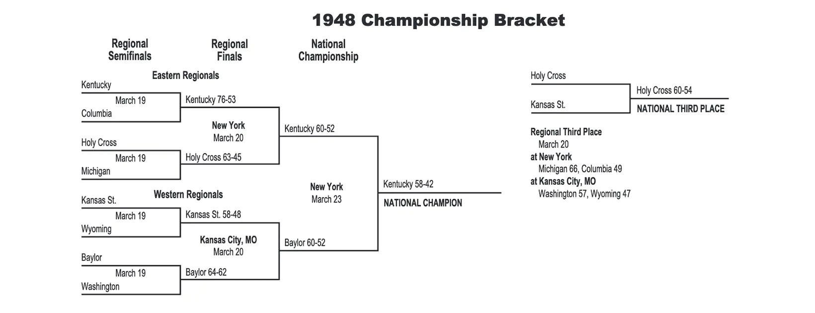 Kentucky won its first-ever national championship in 1948 as the Wildcats knocked off Baylor 58-42 inside Madison Square Garden. Holy Cross and Kansas State also made the Final Four, with the Crusaders winning the third-place game.