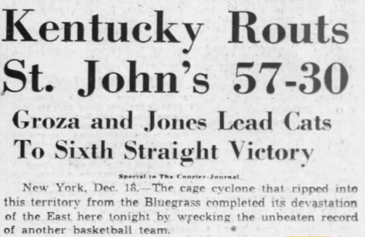 "The cage cyclone that ripped into this territory from the Bluegrass completed its devastation of the East here tonight by wrecking the unbeaten record of another basketball team," reported The Courier-Journal. "Kentucky this time blew St. John's from the ranks of the unbeaten, sweeping to an easy 57-30 triumph."