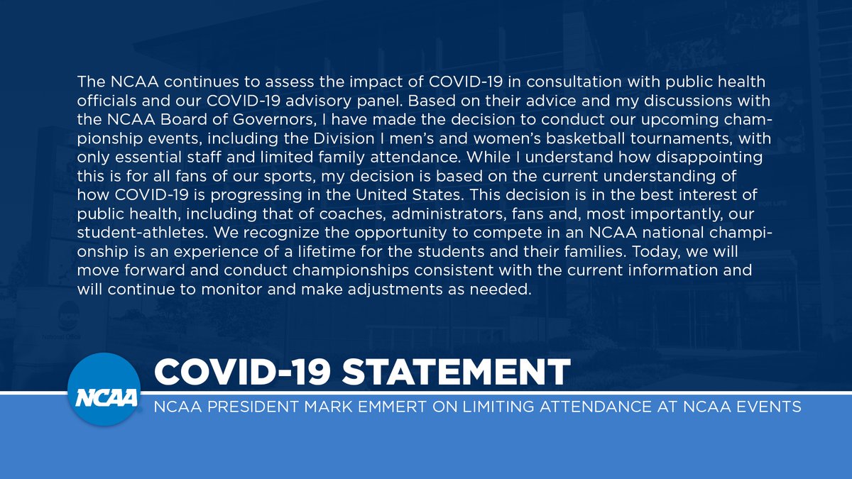 • NCAA President Mark Emmert announced today that upcoming NCAA championship events, including the Division I men's and women's basketball tournaments, will be played with only essential staff and limited family members in attendance.