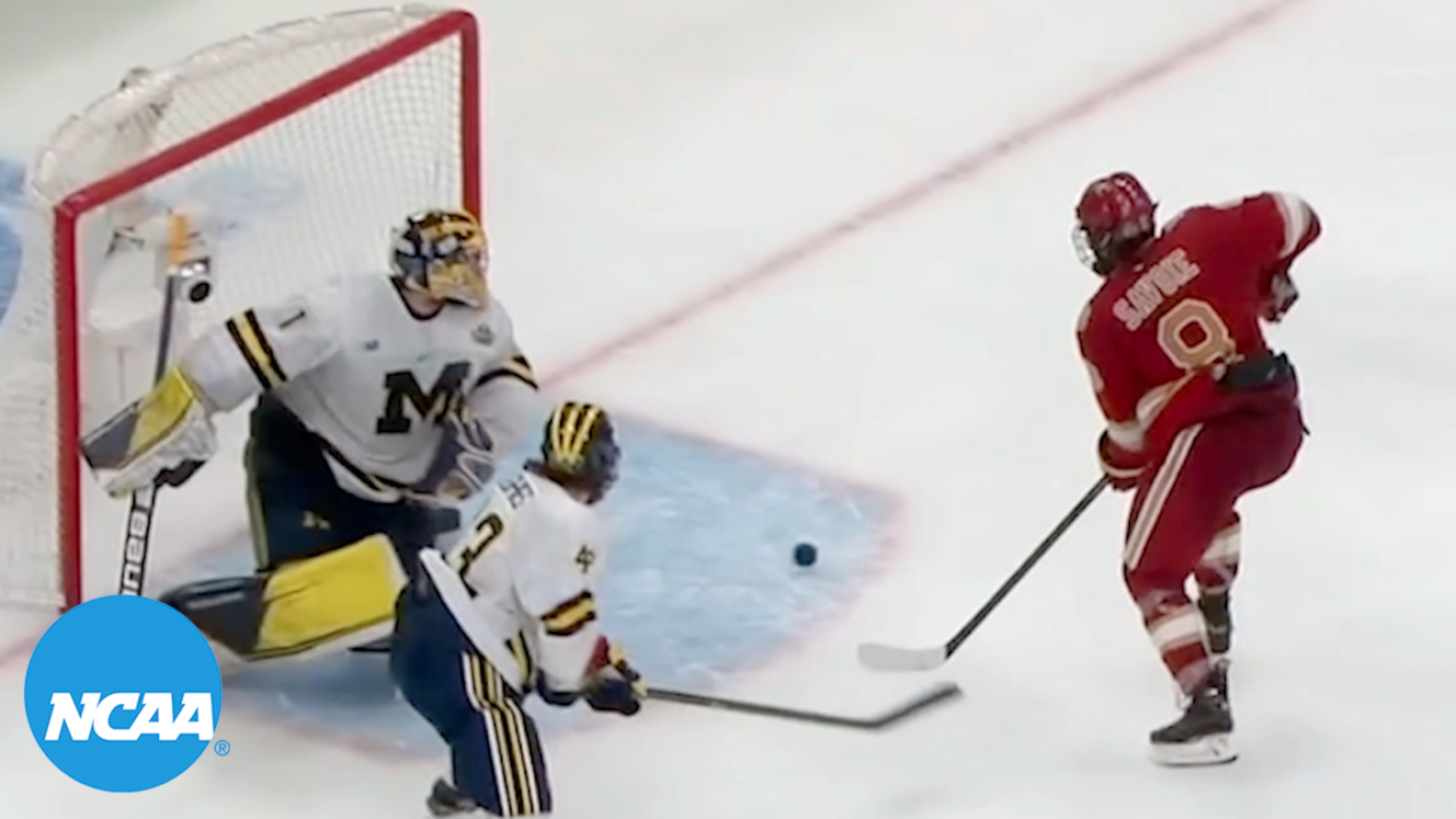 Bobby Brink to Carter Savoie, who scores on his own rebound to send Denver to the national championship with a 3-2 overtime win over Michigan.