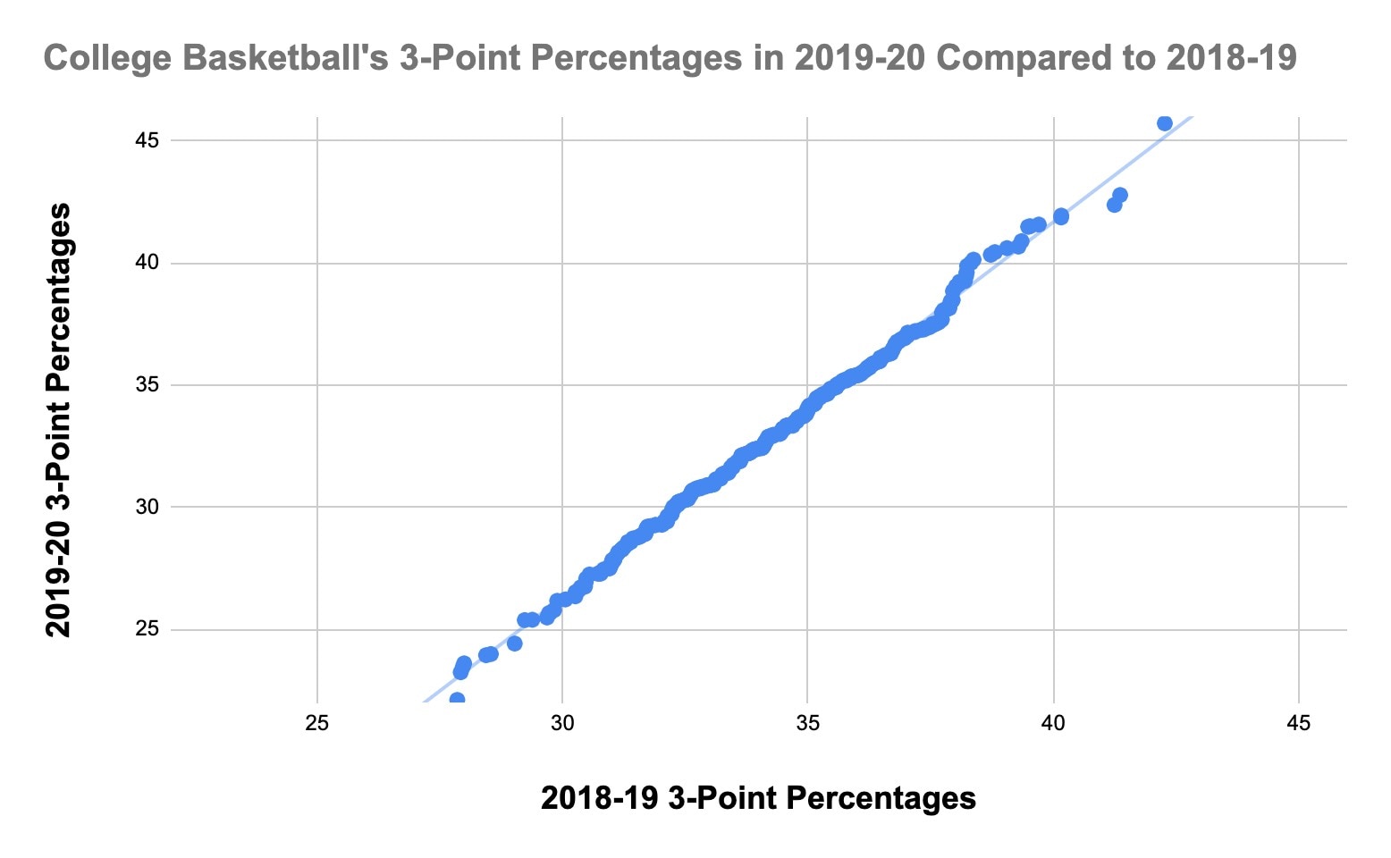 Sure, you might notice more significant results in specific cases on the extreme ends of the spectrum, like Saint Mary's or Florida A&M, but if you turn on the TV on a Tuesday night to watch two teams play in a game in which you have no rooting interest, you may not notice any significant changes in the number of threes attempted or made.