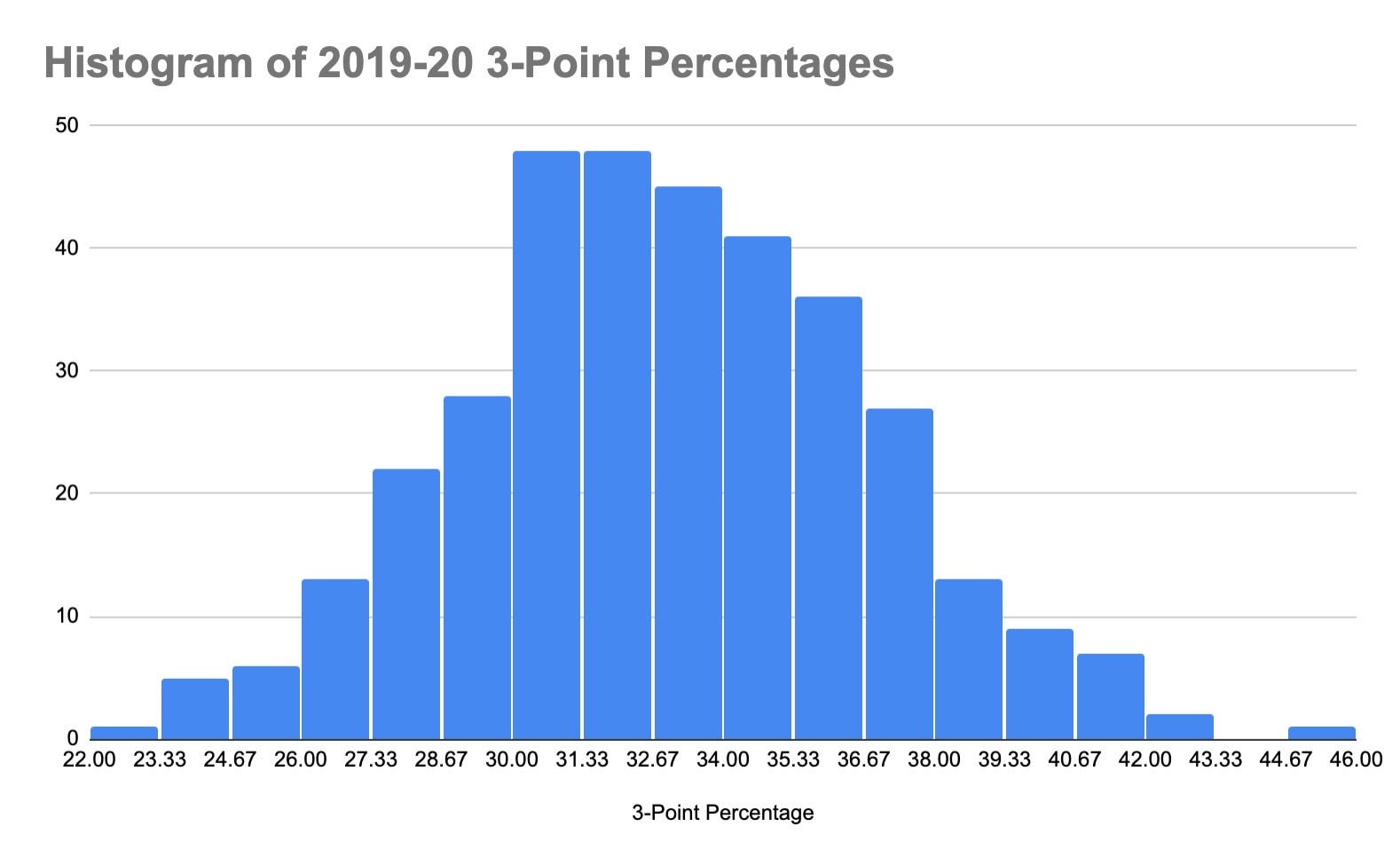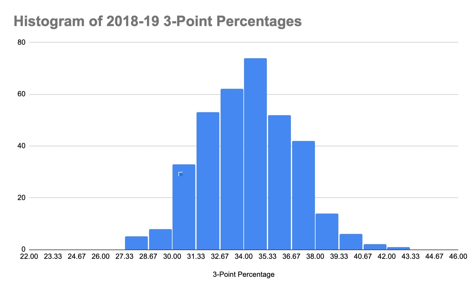 • There are more higher-percentage-shooting teams and more lower-percentage-shooting teams than season. Basically, it's harder — or at least, less likely — to be an average 3-point shooting team this season. Isn't that weird? Actually, not really, there's an explanation for it.