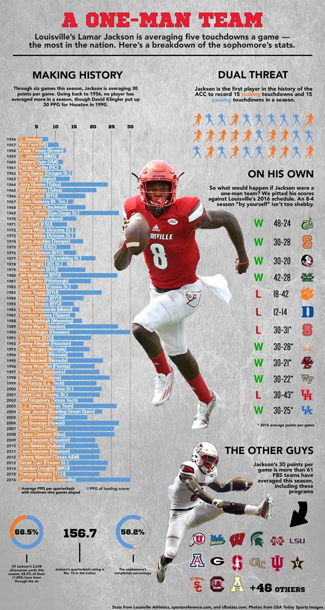 Editor's note: It took one drive for Lamar Jackson to make the above graphic outdated. Jackson scored early on a 36-yard touchdown run and added a 74-yard touchdown pass later in the first quarter. He finished the first half with 340 total yards, three passing TDs and a rushing score. Get complete Louisville vs. North Carolina State stats here.