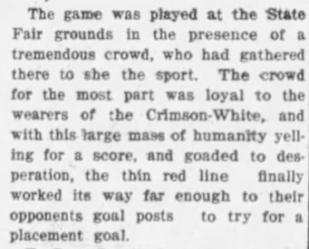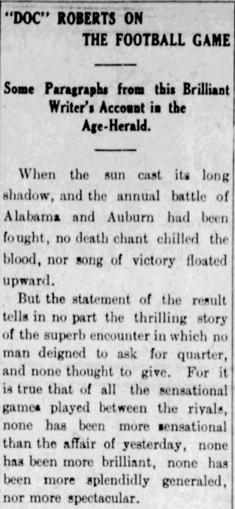 While I was unable to locate a digital copy of the Birmingham Age-Herald after the Alabama-Auburn game, I found a portion of his recap that was published in The Tuscaloosa News on the Tuesday following the game, published on Nov. 19, 1907.