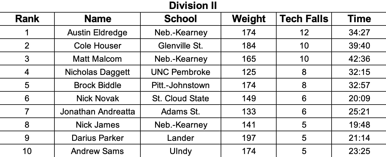 Nebraska-Kearney teammates Austin Eldridge and Malcom continue to lead the way in Division II tech falls. Eldridge holds the overall lead with 12, while Malcom has 10. Glenville State 184-pounder Cole Houser has also moved into double figures with 10 as he earned a pair of tech falls against Davis & Elkins on Friday.