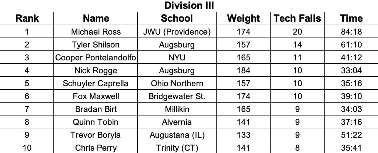 Johnson & Wales 174-pounder Michael Ross had a dominant start to the season and recently added a 20th technical fall to his new Division III record since the implementation of the awards, moving two ahead of the 18 from Stephen Jarrell of Johnson & Wales in 2017. Augsburg 157-pounder Tyler Shilson is having an excellent season in his own right with his 14 tech falls in second putting him significantly ahead of third-place Cooper Pontelandolfo of NYU in third with 11.