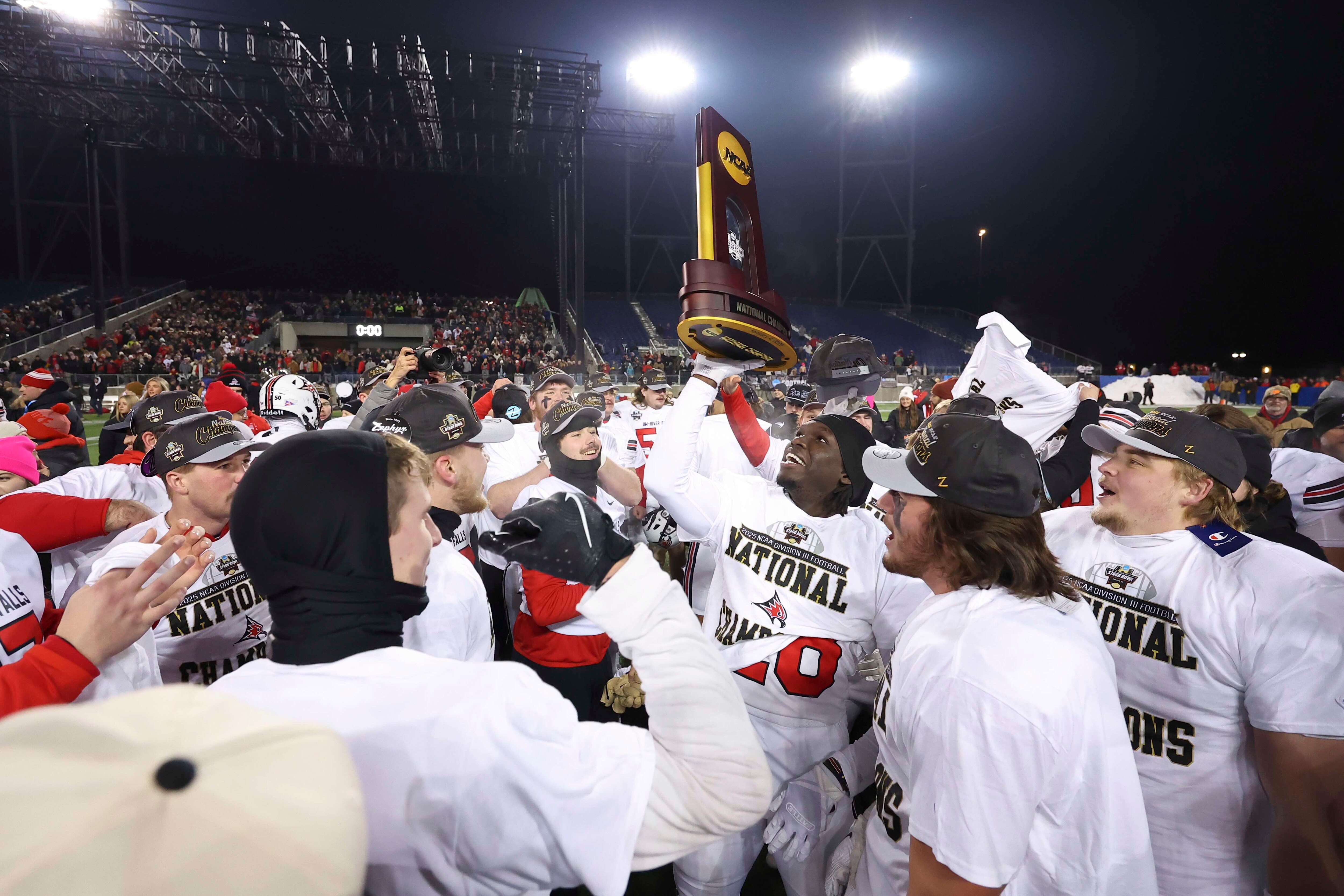 DIII College Football - Home DIII Football UW-River Falls earns first national title in 2025 DIII football championship DIII Football Senior Bowl star Tyren Montgomery's DIII football semifinal highlights DIII Football DIII QB breaks Joe Burrow's historic LSU record in Stagg Bowl DIII Football North Central (IL) vs. UW-River Falls: 2025 Stagg Bowl highlights Division III Football National Championship January 4, 2026 Tom Benson Hall of Fame Stadium | Canton, OH Champ history Championship Highlights DIII Football 2025 — UW-River Falls, North Central (IL) 14 DIII Football 2024 — North Central (IL) 41, Mount Union 25 DIII Football 2023 — Cortland 38, North Central (IL) 37 DIII Football 2022 — North Central (IL) 28, Mount Union 21 DIII Football 2021 — Mary Hardin-Baylor 57, North Central (IL) 24 Explore More DIII Football 2024 Academic All-America Football team announced for NCAA Division III Follow DIII Football
